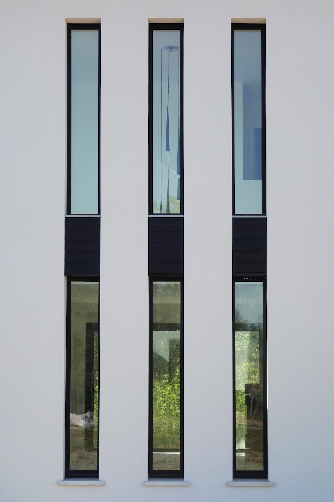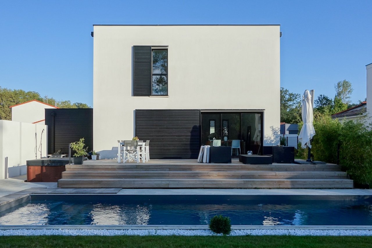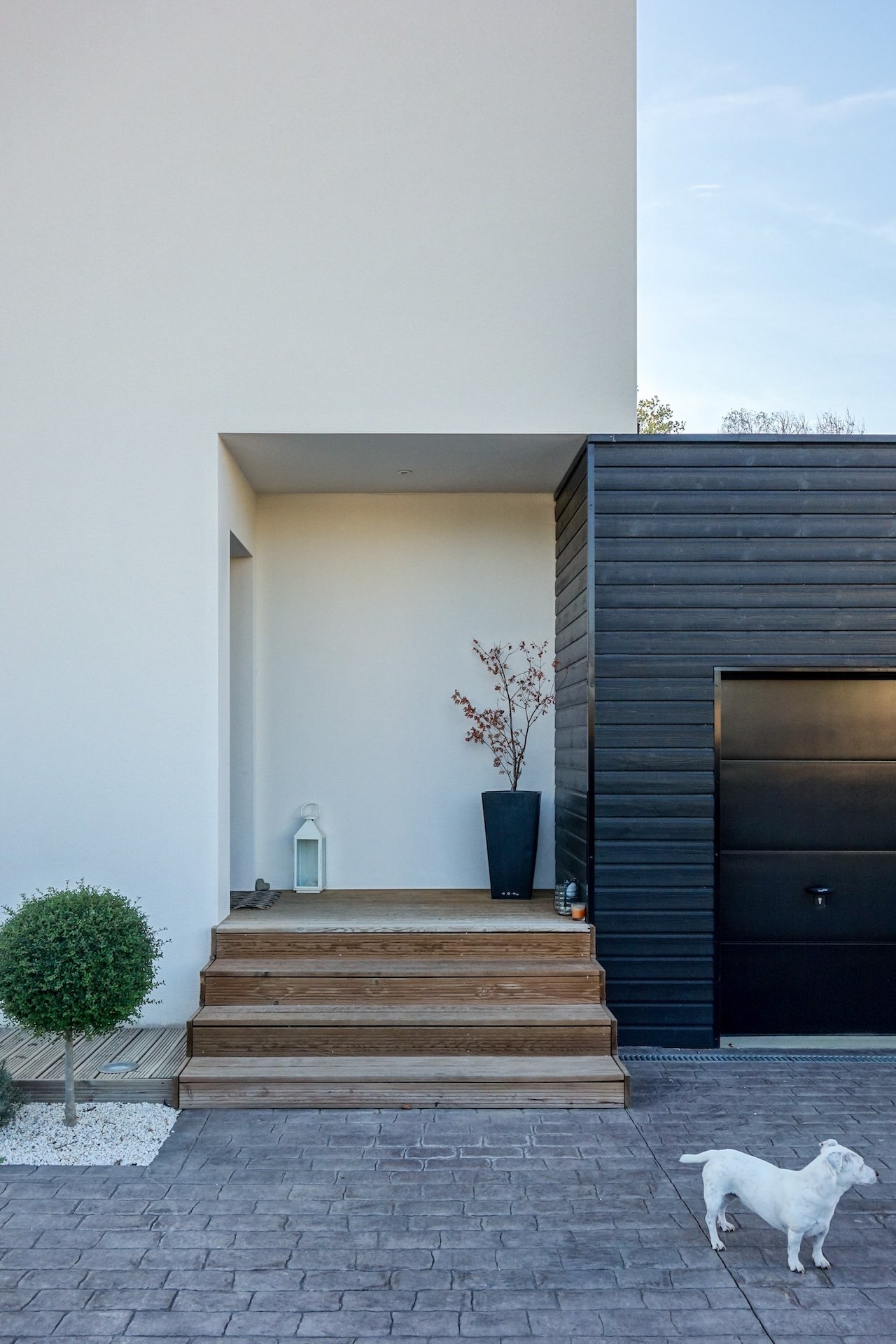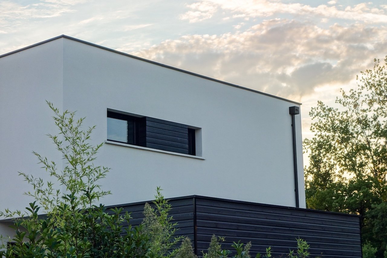 Situé dans une zone réglementée par le plan de prévention des risques d’inondation, la maison se retrouve surélevée de 1 mètre par rapport au terrain naturel. Cette contrainte de base participe à l’alignement des volumes et à l’articulation des pleins et des vides recherchés en façade. Le bardage bois de couleur foncé est utilisé ponctuellement pour marquer le volume du garage et unifier visuellement certaines ouvertures. Le même bois recouvre les volets coulissants de la maison. La palette de couleur des matériaux choisis est volontairement restreinte et renforce ainsi le côté épuré de la maison.