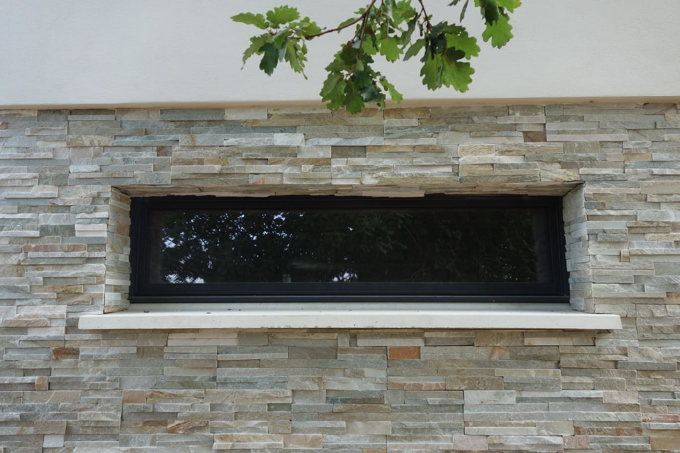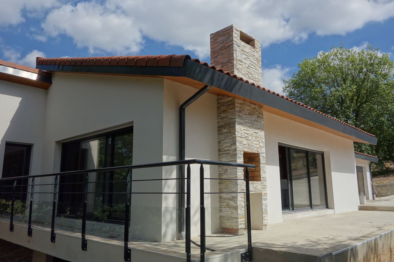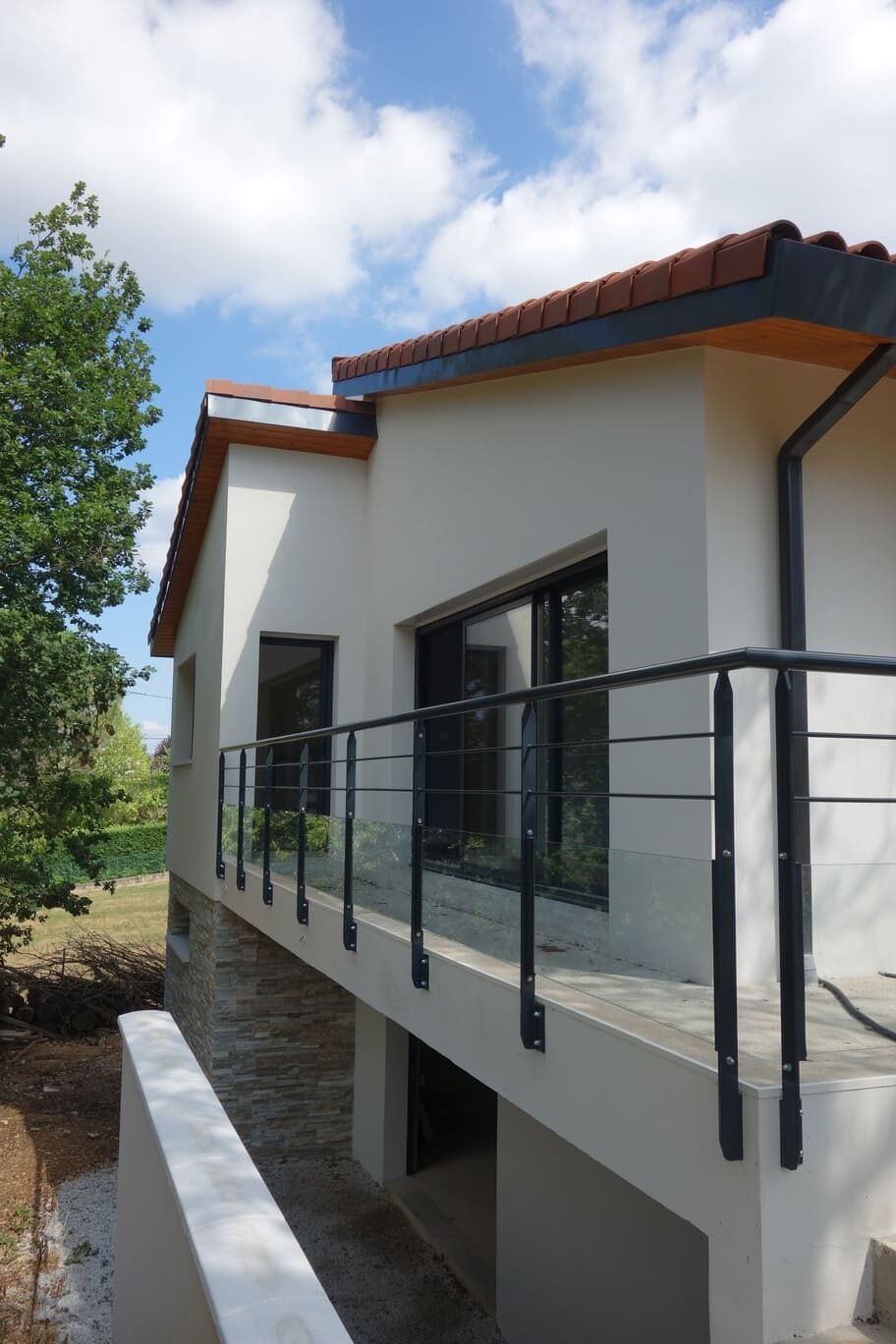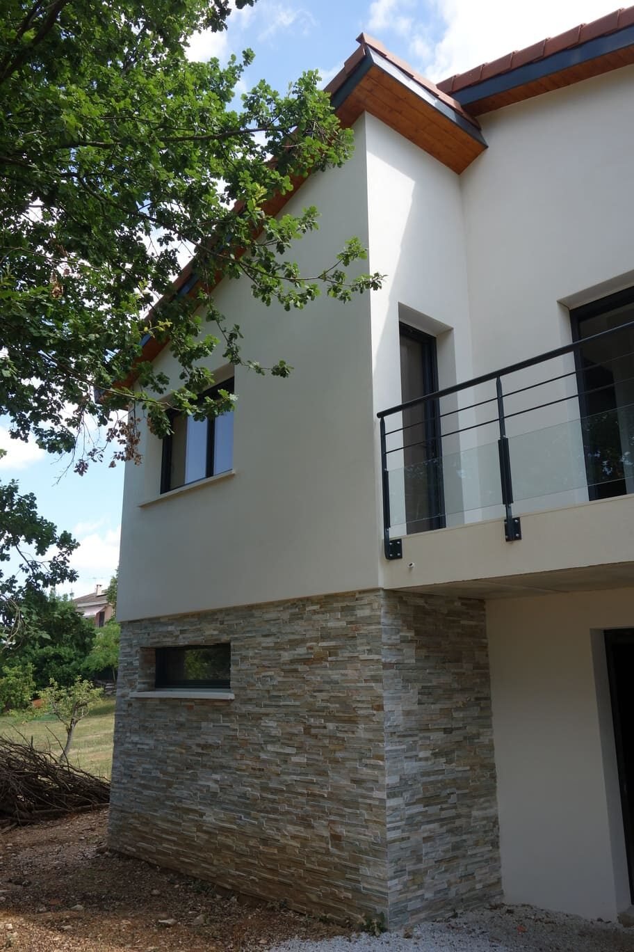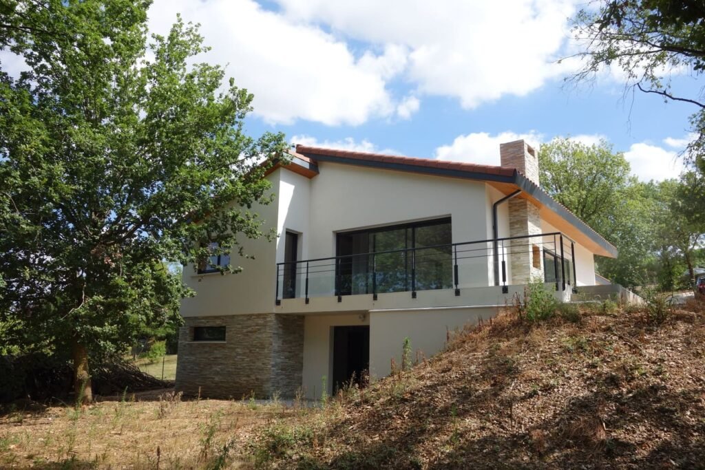 Le terrain, étroit et linéaire, s’étend sur 3600 m² avec une pente de 16 % vers le sud-ouest. La maison s’implante en partie haute, préservant ainsi la végétation dense en contrebas. Dès l’origine, le projet s’est inscrit dans une démarche bioclimatique, tirant parti des atouts du site pour guider la conception. L’habitation se développe sur deux niveaux : un rez-de-chaussée de 124 m² avec un garage attenant de 34 m², et un sous-sol semi-enterré sous la surface habitable. La distribution intérieure se devine aisément depuis l’extérieur : le séjour, plus haut, marque un décalage volumétrique, encadré au nord par l’espace nuit et à l’est par l’entrée, située dans un redent entre séjour et garage. Un jeu de toitures en pente renforce cette hiérarchie des volumes. Un soin particulier a été porté au confort thermique. De généreuses baies vitrées coulissantes orientées sud-est et sud-ouest permettent de s’ouvrir largement sur la terrasse et le balcon et surtout de profiter des apports solaires gratuits et de chauffer la maison en hiver. Ces apports sont néanmoins maitrisés grâce à une pergola et des volets roulants à lames orientables, protégeant la maison des surchauffes estivales.