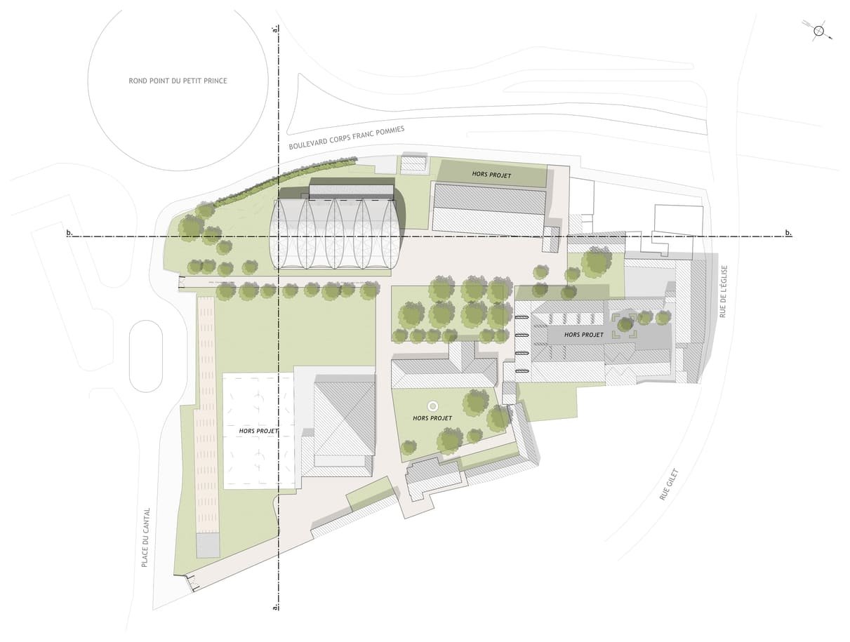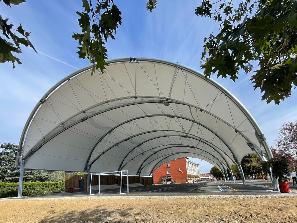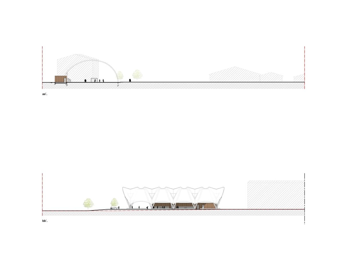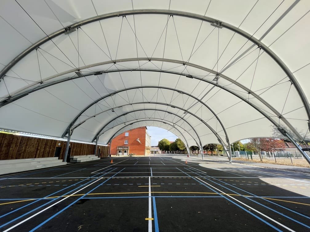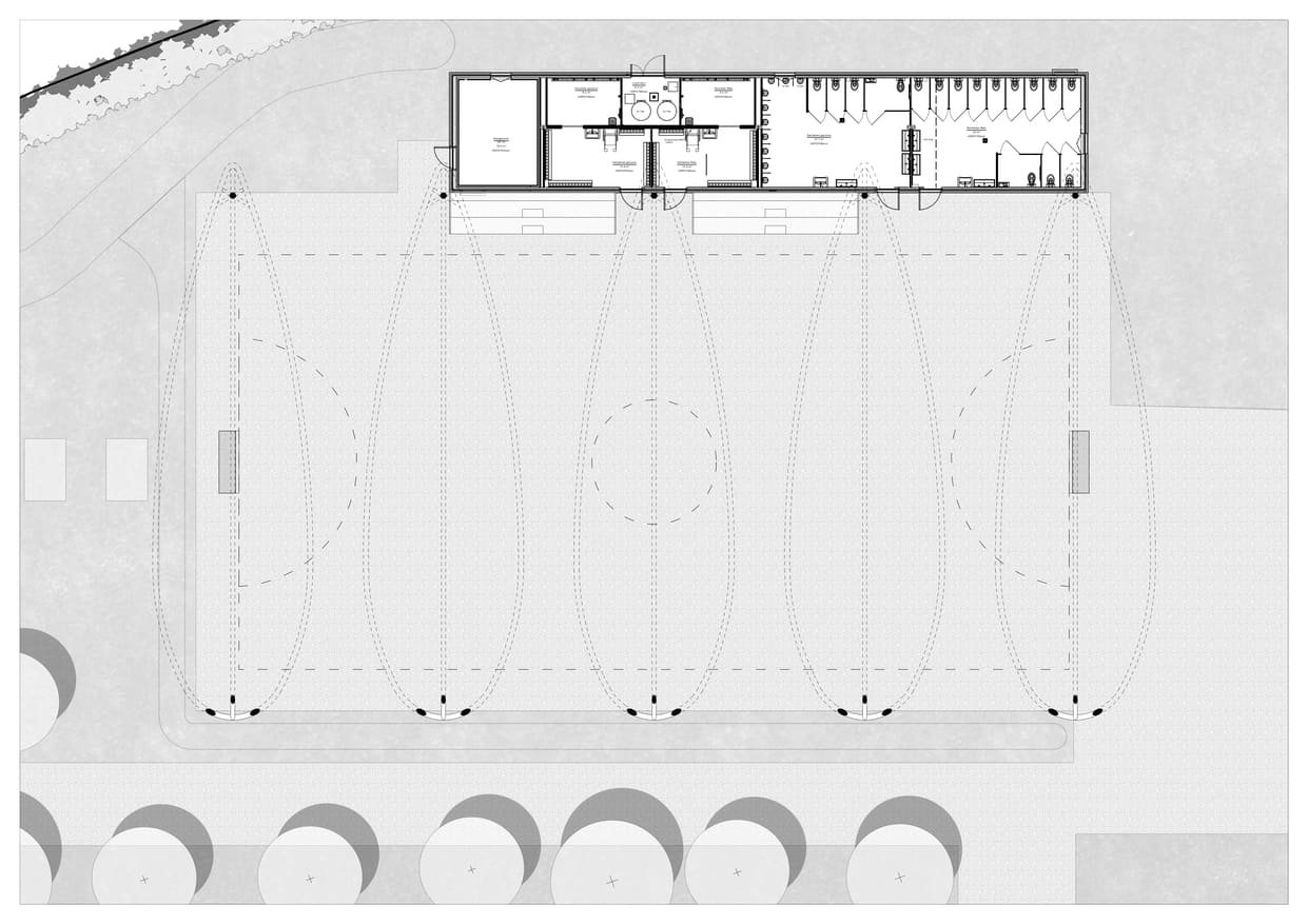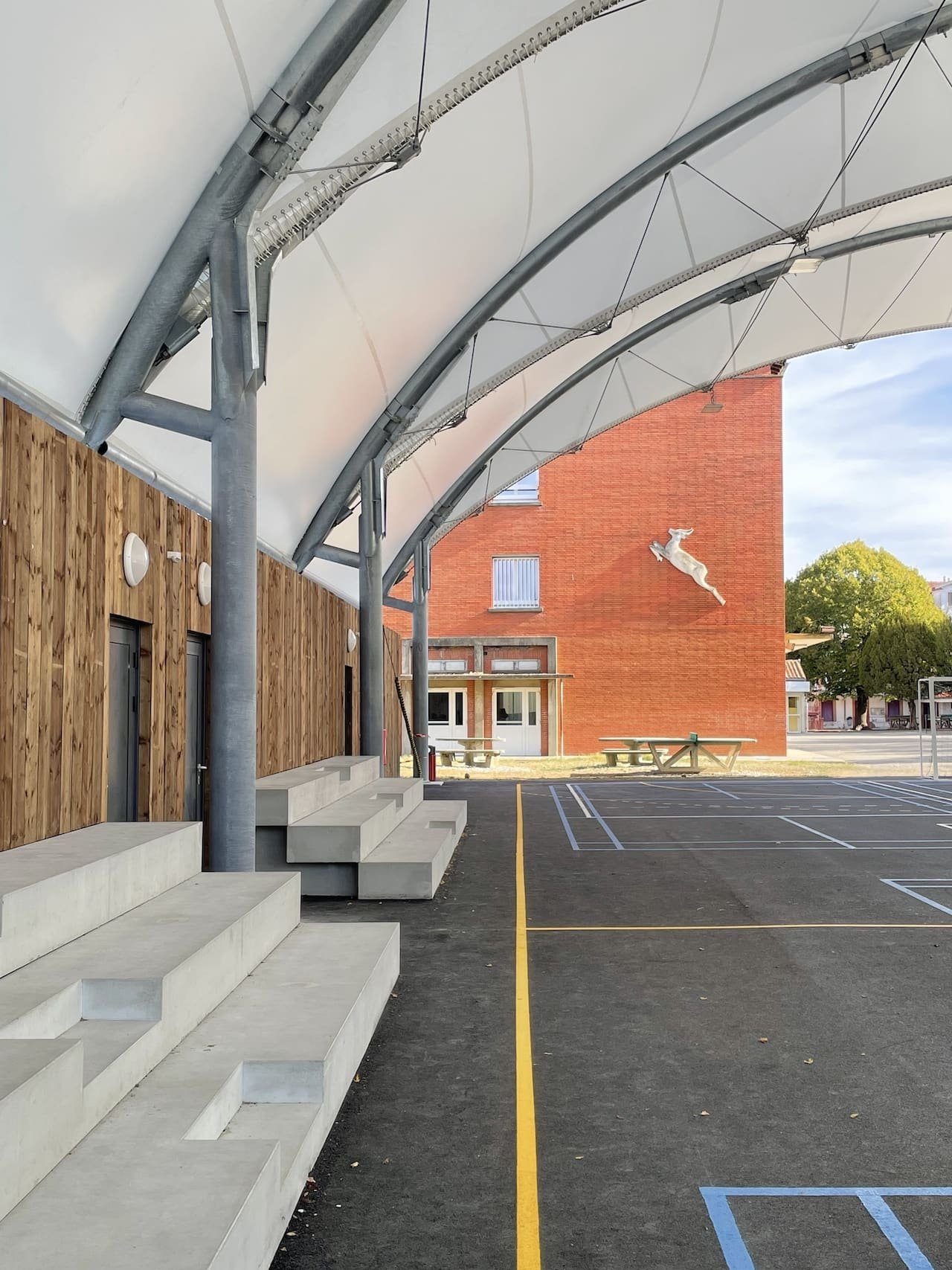 Afin de répondre à la problématique et à lier ces deux espaces, des gradins ont étés préfabriqués en béton et ont été accolés aux vestiaires. La structure supportant la couverture du terrain de sport présente une volumétrie complexe, composée de 5 paires d’arc inclinées. La partie Ouest est surélevée afin de passer au-dessus du volume des vestiaires.