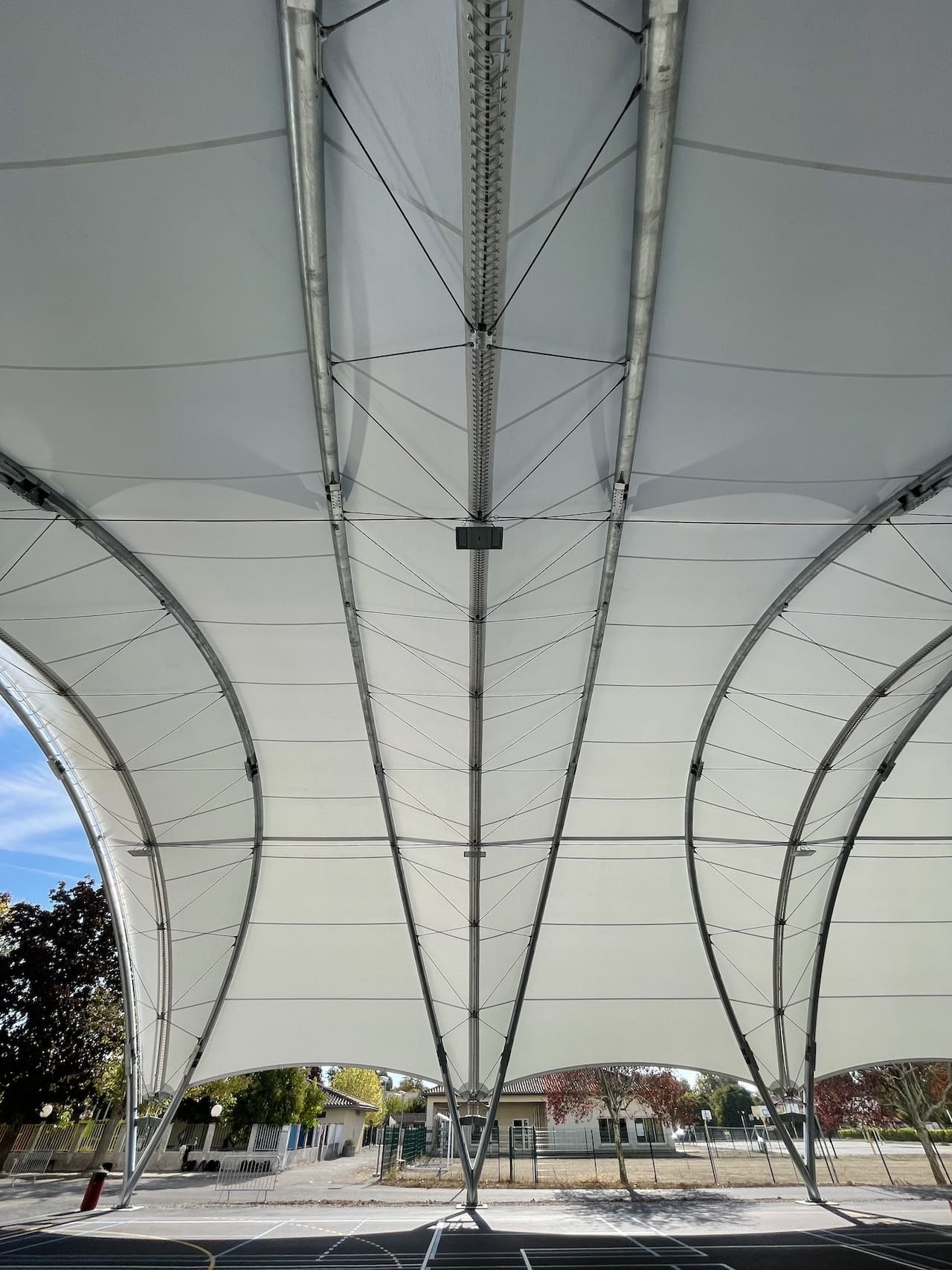 La réponse aux besoins du groupe scolaire fut assez formelle : d’une part un parallélépipède rectangle habillé d’un bardage claire-voie afin d’accueillir les espaces « privés » des étudiants et d’autre part une structure légère à la forme organique, constituée d’acier et de toile tendue permettant d’abriter l’aire de jeu polyvalente.