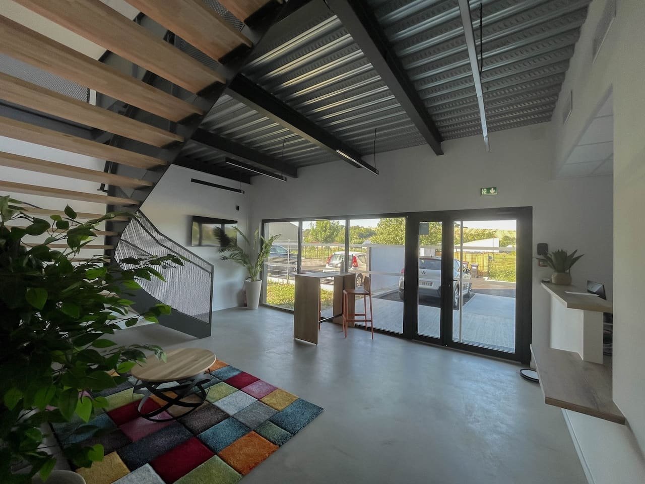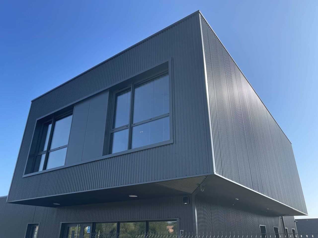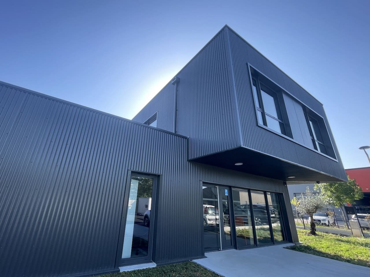 Situé dans une zone d’activités à proximité directe du canal du midi, le projet consistait à construire le nouveau siège social d’une entreprise en plein développement. La volonté était de réaliser un bâtiment typé industriel avec des volumes volontairement simples et épurés. L’étage vient se poser en décalage du rez-de-chaussée avec un double porte à faux permettant de marquer et d’abriter l’entrée. L’ossature métallique a été choisie pour le système constructif. Un même bardage métallique de couleur foncé recouvre l‘ensemble du bâtiment. Les sols intérieurs ont été traité en béton entièrement laissés à l’état brut.